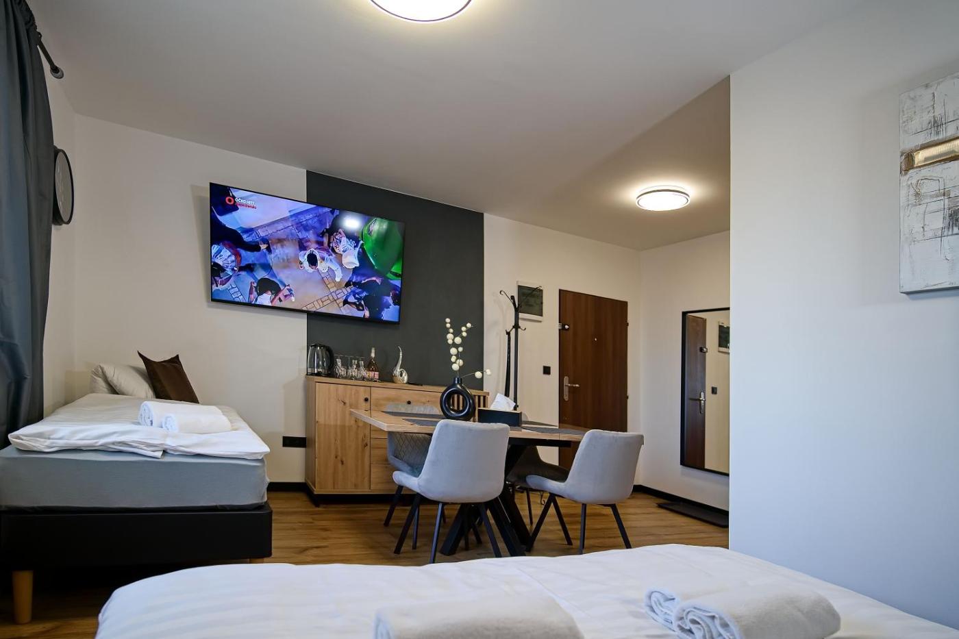 Standard Apartment. The apartment has 1 bedroom and 1 bathroom with a shower and free toiletries. The kitchen features a stovetop and a refrigerator This apartment features a tea and coffee maker, a seating area, flat-screen TV with cable channels, as well as winechampagne for guests. The unit has 3 beds. ;